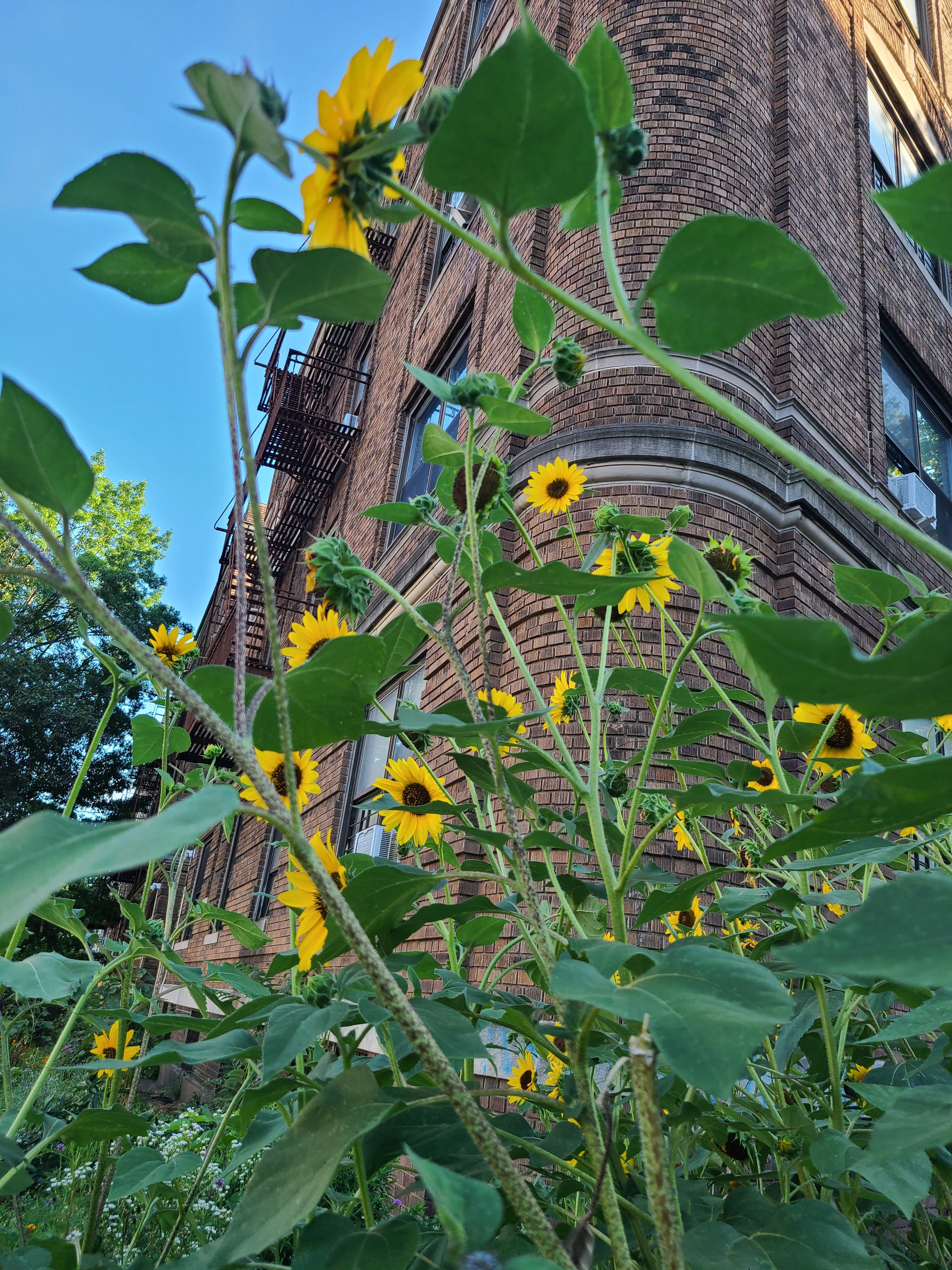 This brings daily joy as I wait for the bus at Ocean Ave & Foster. Last year, a tenant in this building used her own funds to plant a garden on the corner in front of her building. This year, it’s bursting in blooms, and especially lots and lots of sunflowers wrapping both sides of the building. I’ve spoken with her a few times as I waited for the bus and even had to donate to her amazing endeavor.