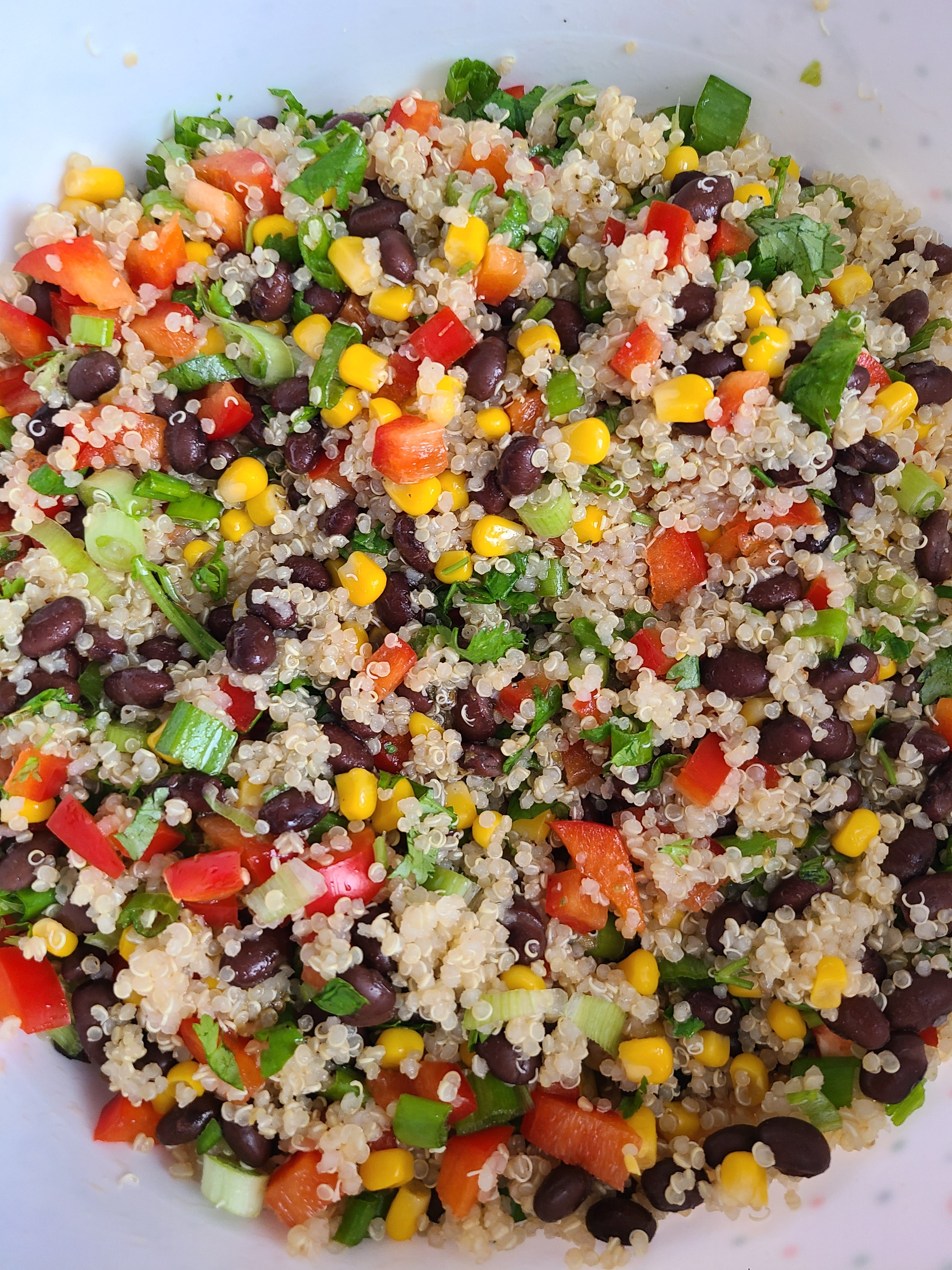 It felt so good to finally have the energy to make this simple salad. A large bowl will last all week. Super healthy - quinoa, red peppers, black beans, corn, scallions, and cilantro tossed with a dressing of oil, vinegar, fresh squeezed limes, & oregano. And it’s colorful. Also, it’s perfect to take to the beach.
